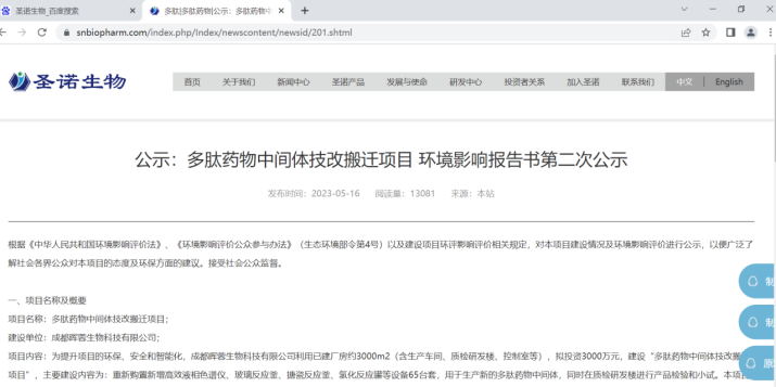 本項目在圣諾生物官網上進行了征求意見稿網絡公示,時間為2023年5月16日~2023年5月30日(10個工作日)。圣諾生物官網為對外公開,易于公眾接觸及閱讀的網站。公示信息的網址為: