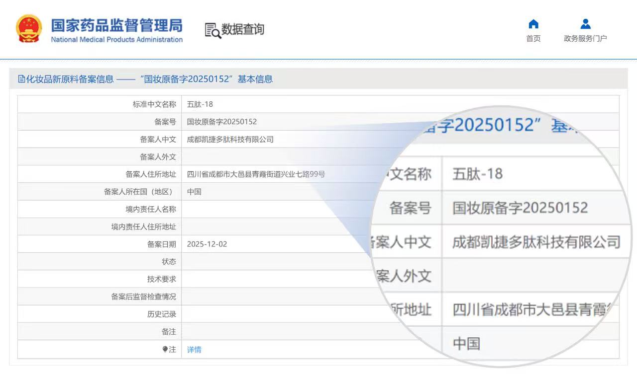 12月2日,圣諾生物化妝品新原料“五肽-18”(國(guó)妝原備字20250152)正式通過(guò)國(guó)家藥監(jiān)局備案!目前,圣諾生物全資子公司-成都凱捷多肽科技有限公司共成功備案了4款多肽新原料。